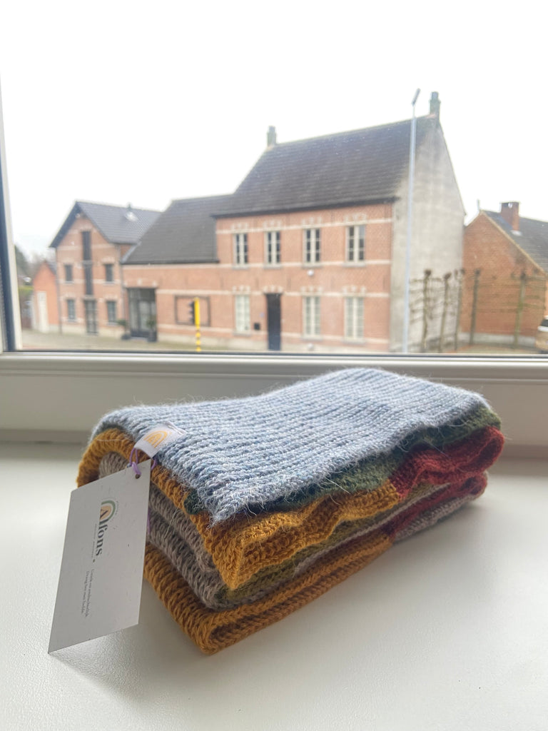 van 100% baby alpaca (dat is vacht van de eerste scheerbeurt van de alpaca) uit Arequipa, Peru en gebreid in Ramsel, België.